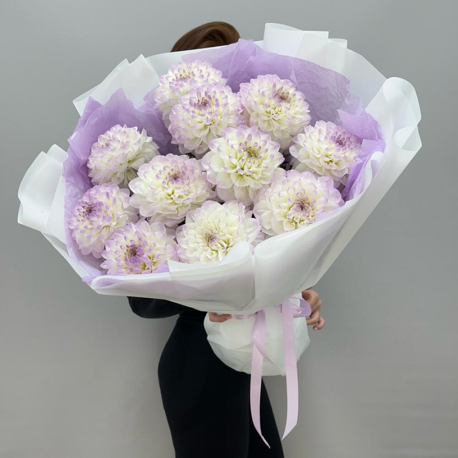 На фото букет из 11 белых георгин. В составе: георгина 11 шт, дизайнерская упаковка 1 шт, атласная лента 1 шт, . Все цветы свежие и ароматные, букет красиво оформлен и отлично подходит для подарка. Доступна доставка цветов или самовывоз.