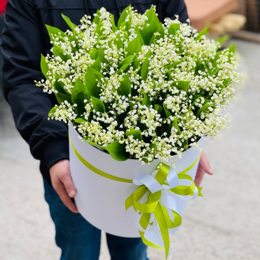 На фото ландыши в шляпной коробке xl. В составе: ландыш 75 шт, шляпная коробка (xl) 1 шт, атласная лента 2 шт, . Все цветы свежие и ароматные, букет красиво оформлен и отлично подходит для подарка. Доступна доставка цветов или самовывоз.